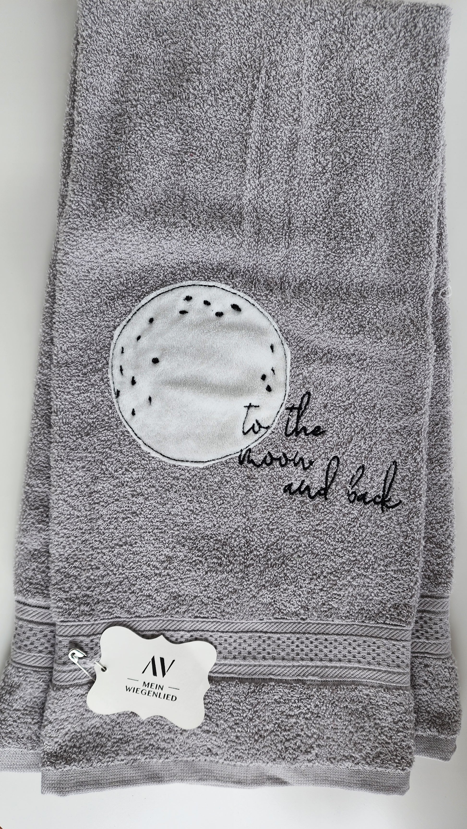 Badehandtuch grau , bestickt mit einem Mond.