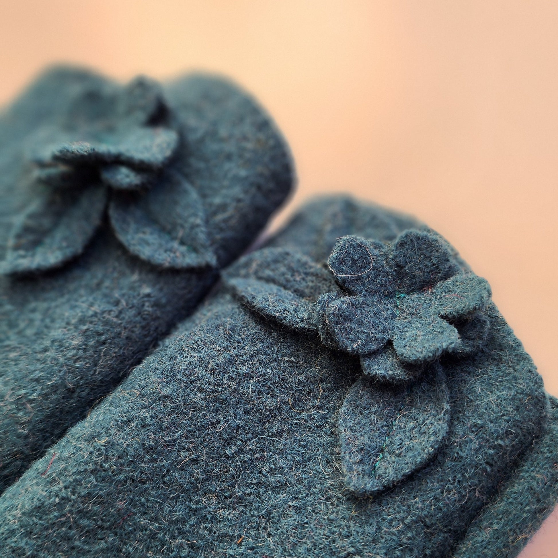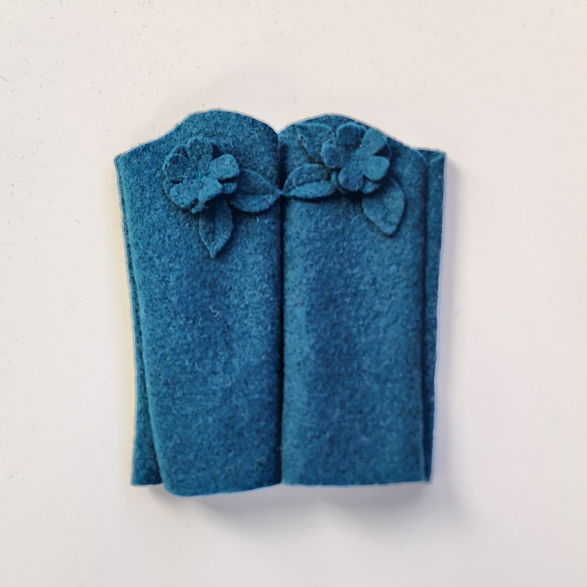 Diese petrol-farbenen Pulswärmer aus Schafswolle sind besonders durch die feinen Blumen ein absolutes Highlight. Edel und fast wie ein kleines Blumengesteck sind sie liebevoll an ihren Platz arrangiert worden.