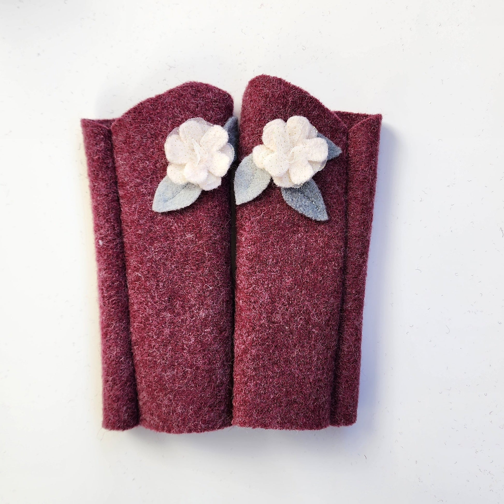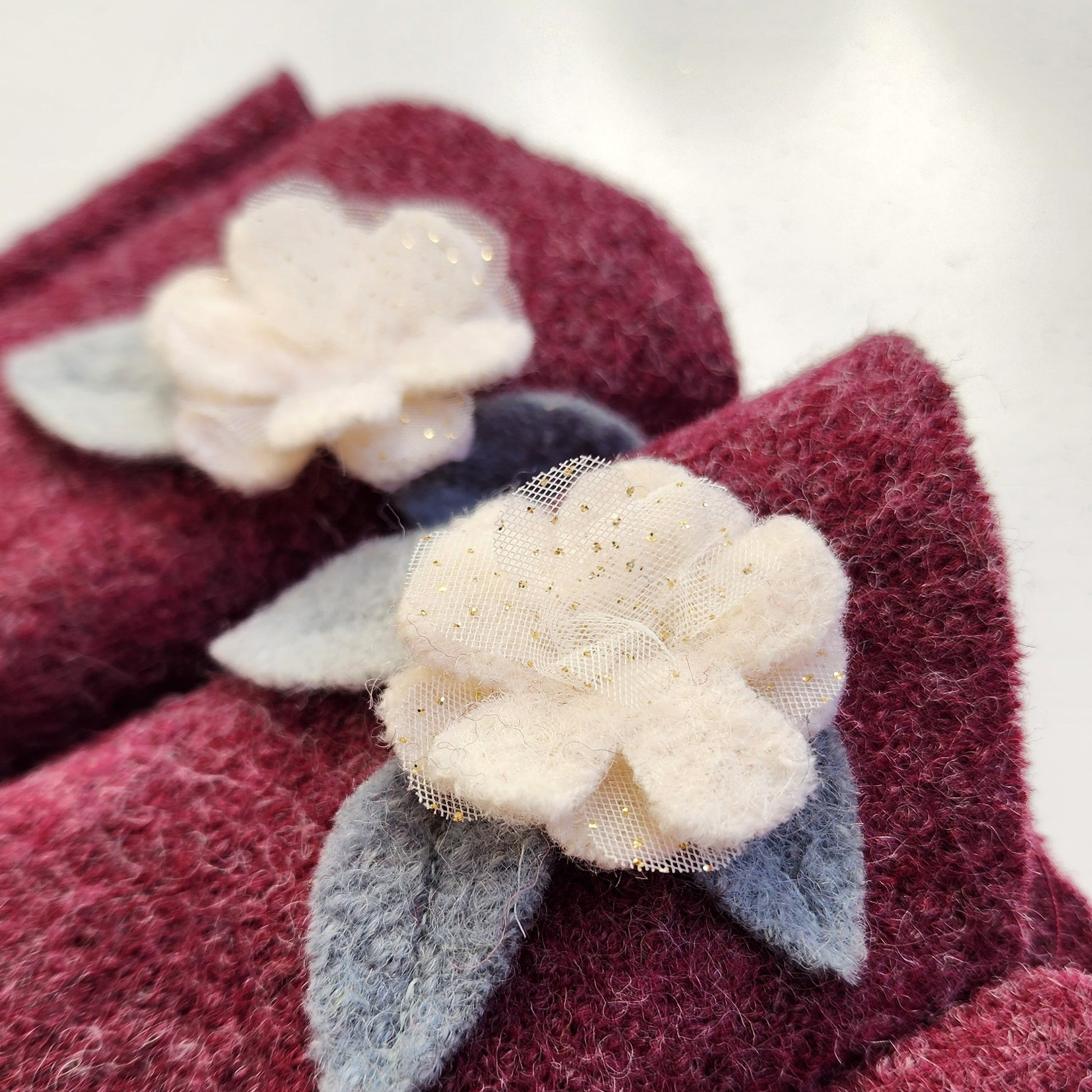 Diese bordeaux-farbenen Pulswärmer aus Schafswolle sind besonders durch die feinen Blumen ein absolutes Highlight. Edel und fast wie ein kleines Blumengesteck sind sie liebevoll an ihren Platz arrangiert worden.