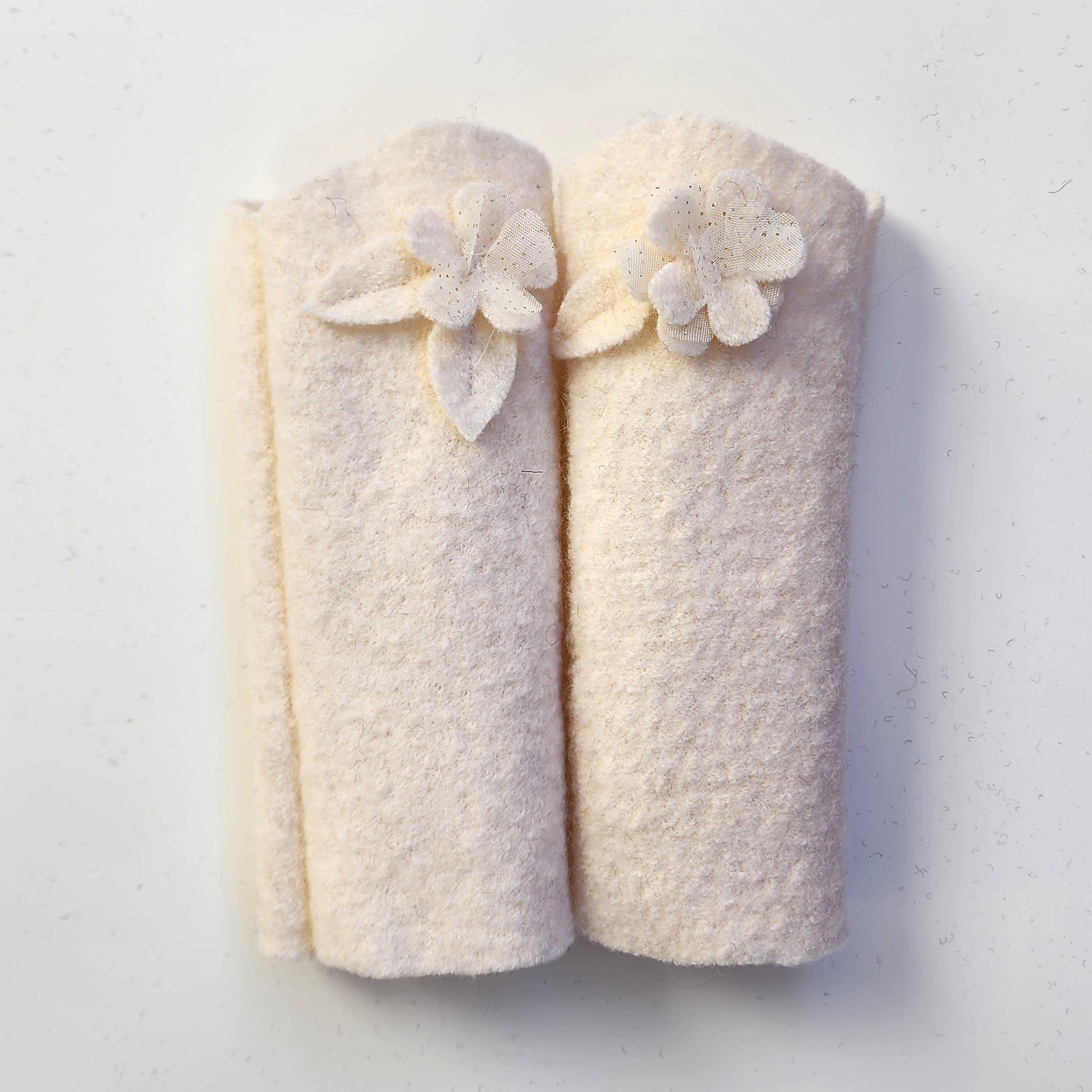 Diese creme-farbenen Pulswärmer aus Schafswolle sind besonders durch die feinen Blumen ein absolutes Highlight. Edel und fast wie ein kleines Blumengesteck sind sie liebevoll an ihren Platz arrangiert worden.