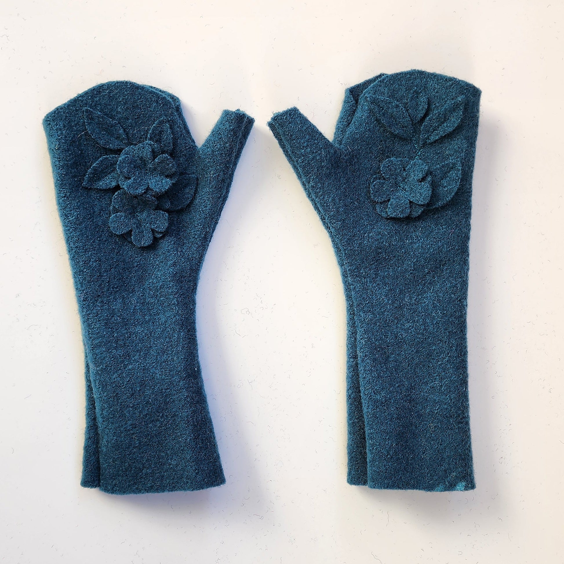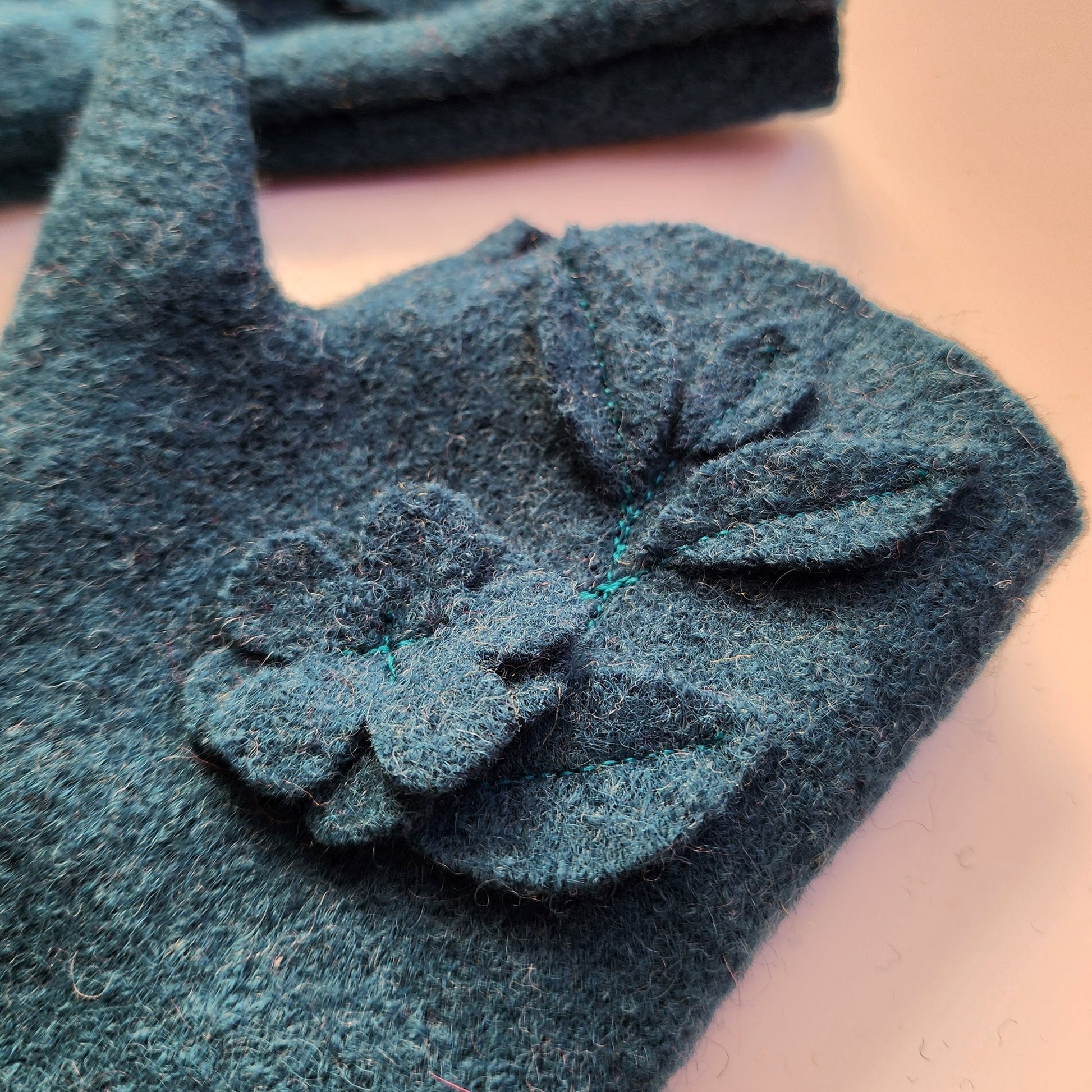 Diese petrol-farbenen Handstulpen aus Schafswolle sind besonders durch die die Blumen ein absolutes Highlight. Edel und fast wie ein kleines Blumengesteck sind sie liebevoll an ihren Platz arrangiert worden.