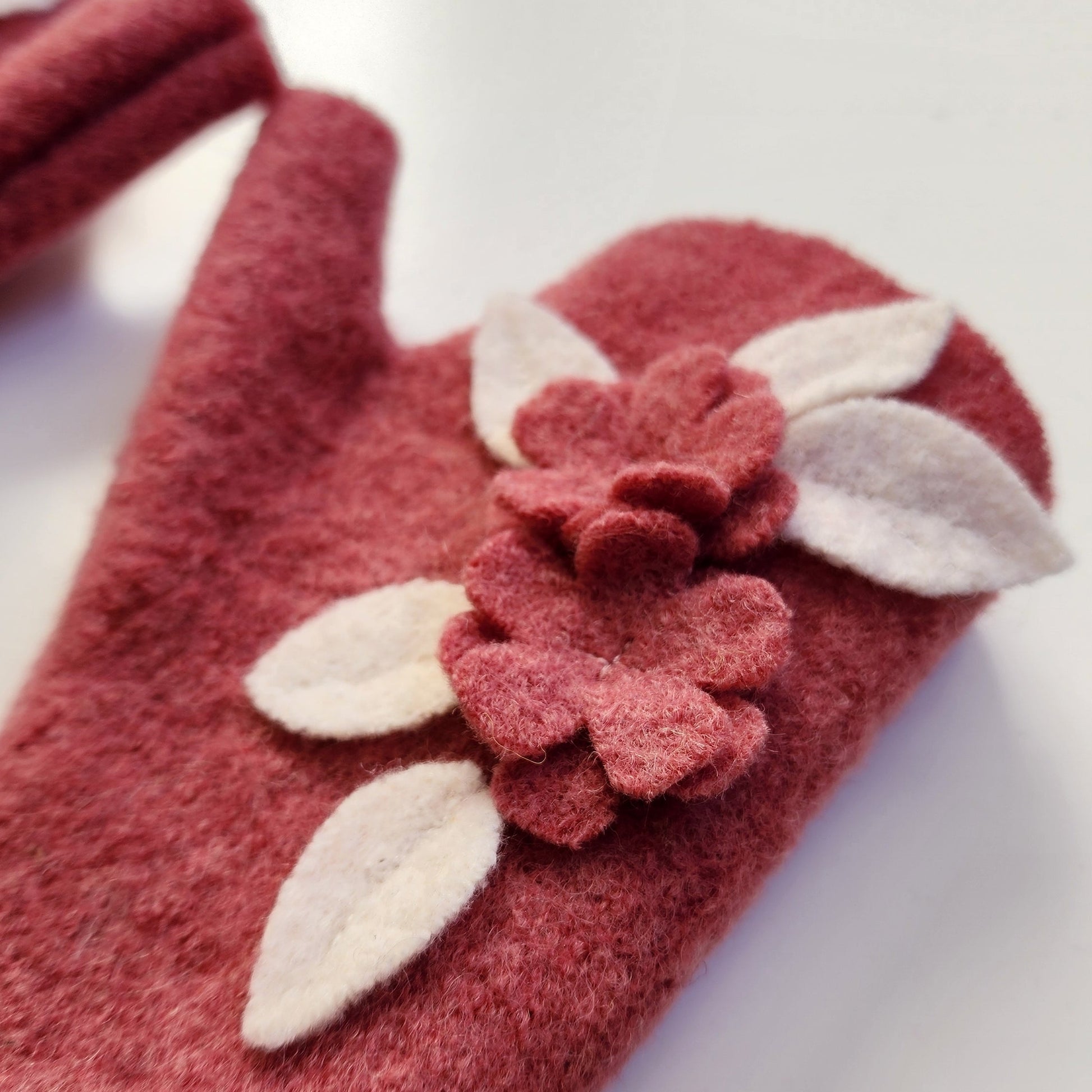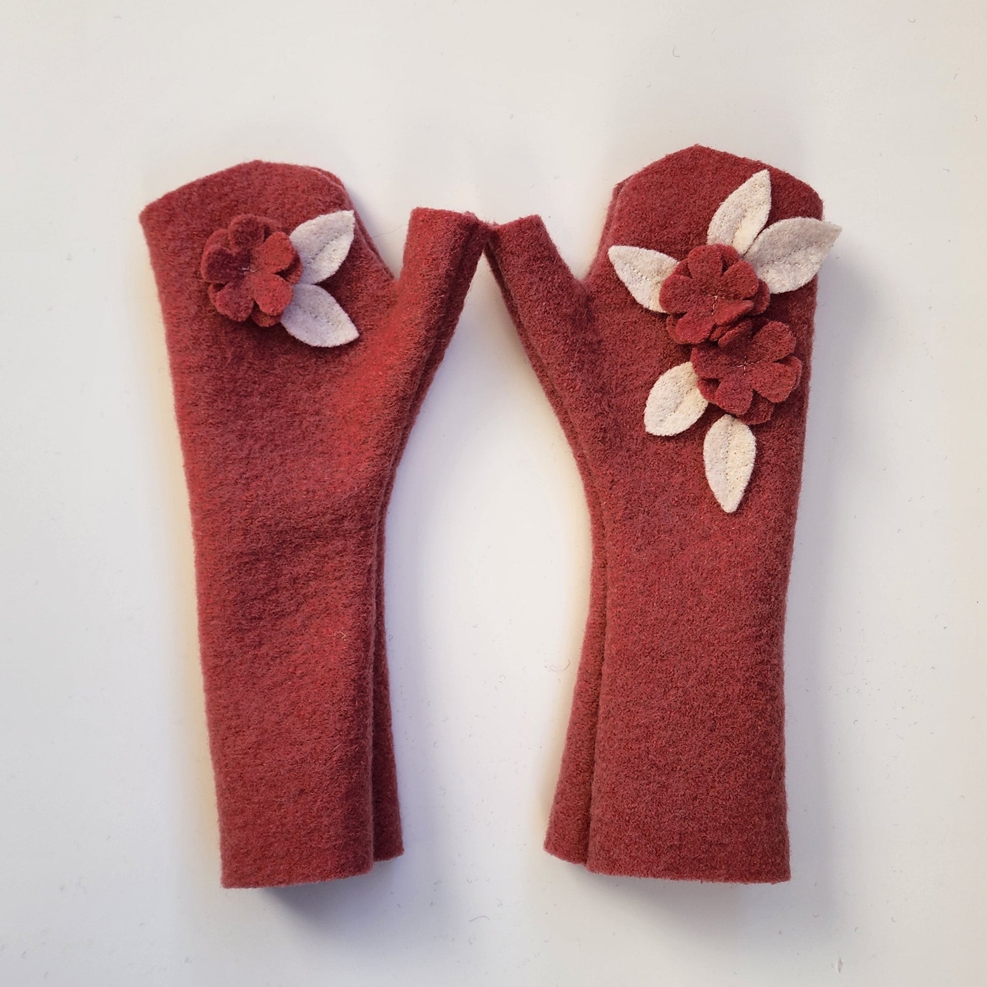 Diese koralle-farbenen Handstulpen aus Schafswolle sind besonders durch die die Blumen ein absolutes Highlight. Edel und fast wie ein kleines Blumengesteck sind sie liebevoll an ihren Platz arrangiert worden.