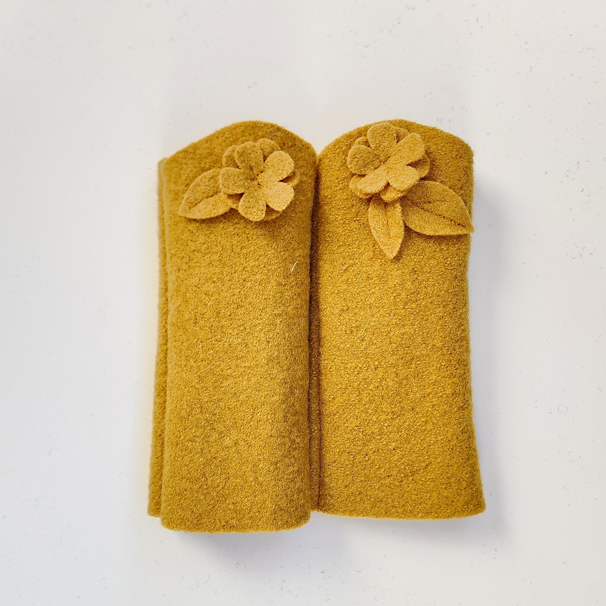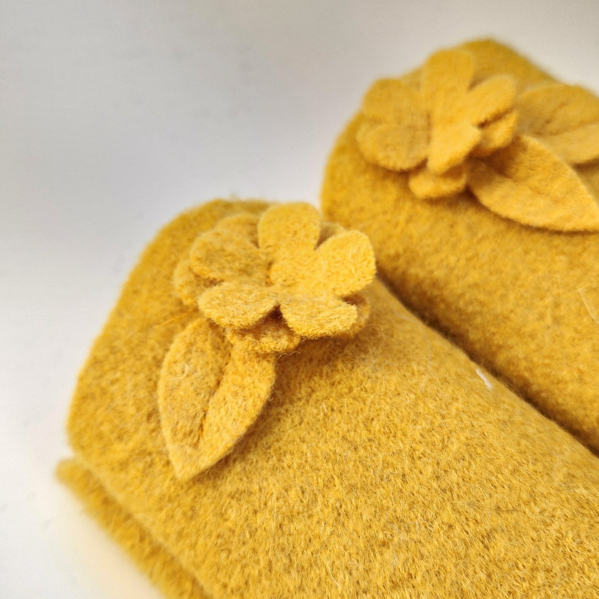 Diese senfgelben Pulswärmer aus Schafswolle sind besonders durch die die Blumen ein absolutes Highlight. Edel und fast wie ein kleines Blumengesteck sind sie liebevoll an ihren Platz arrangiert worden.