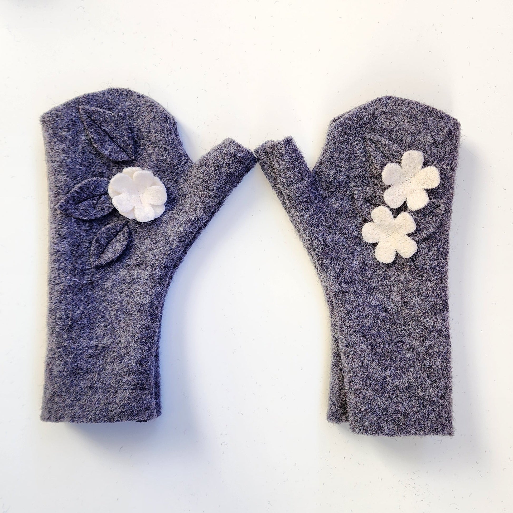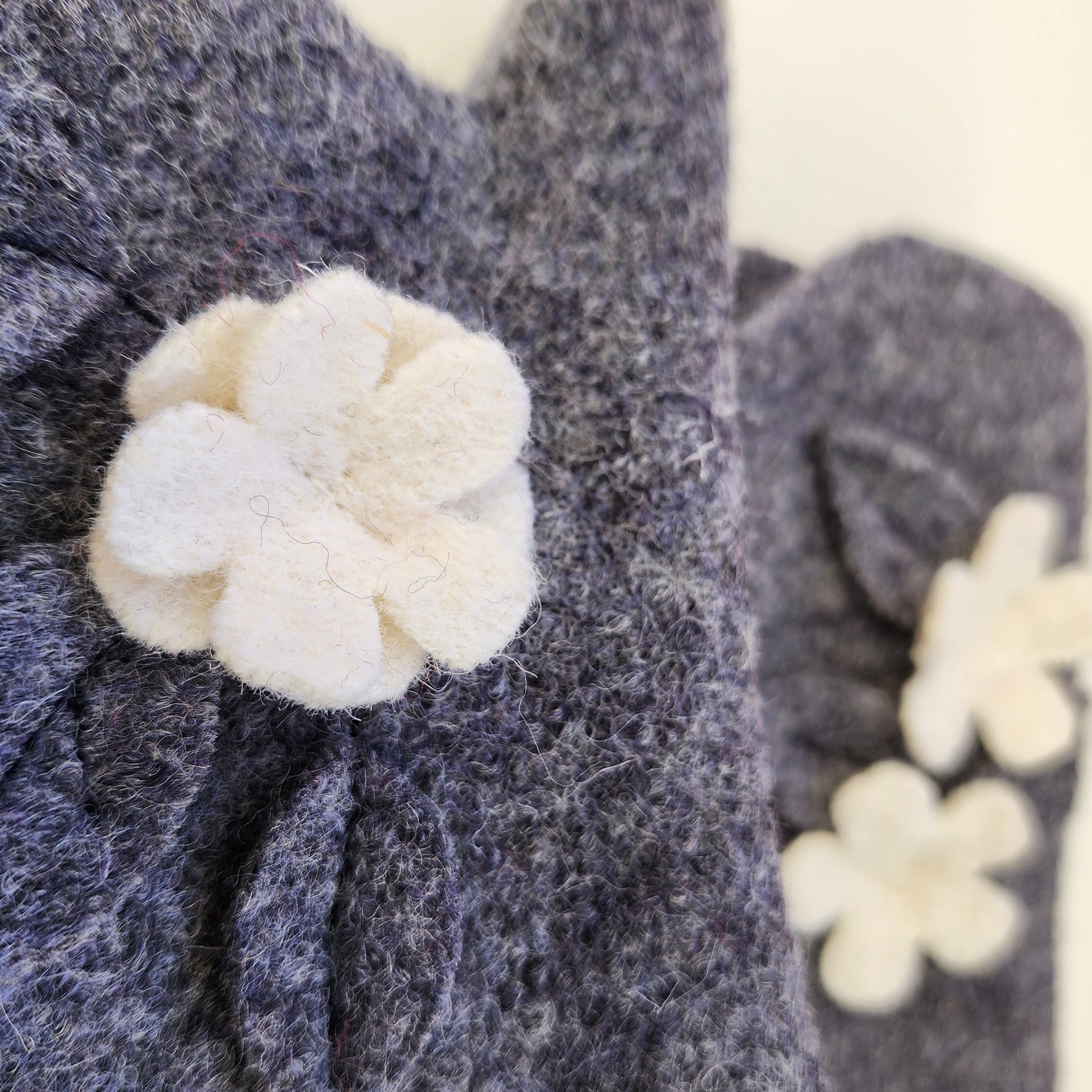 Diese grauen Handstulpen aus Schafswolle sind besonders durch die die Blumen ein absolutes Highlight. Edel und fast wie ein kleines Blumengesteck sind sie liebevoll an ihren Platz arrangiert worden.