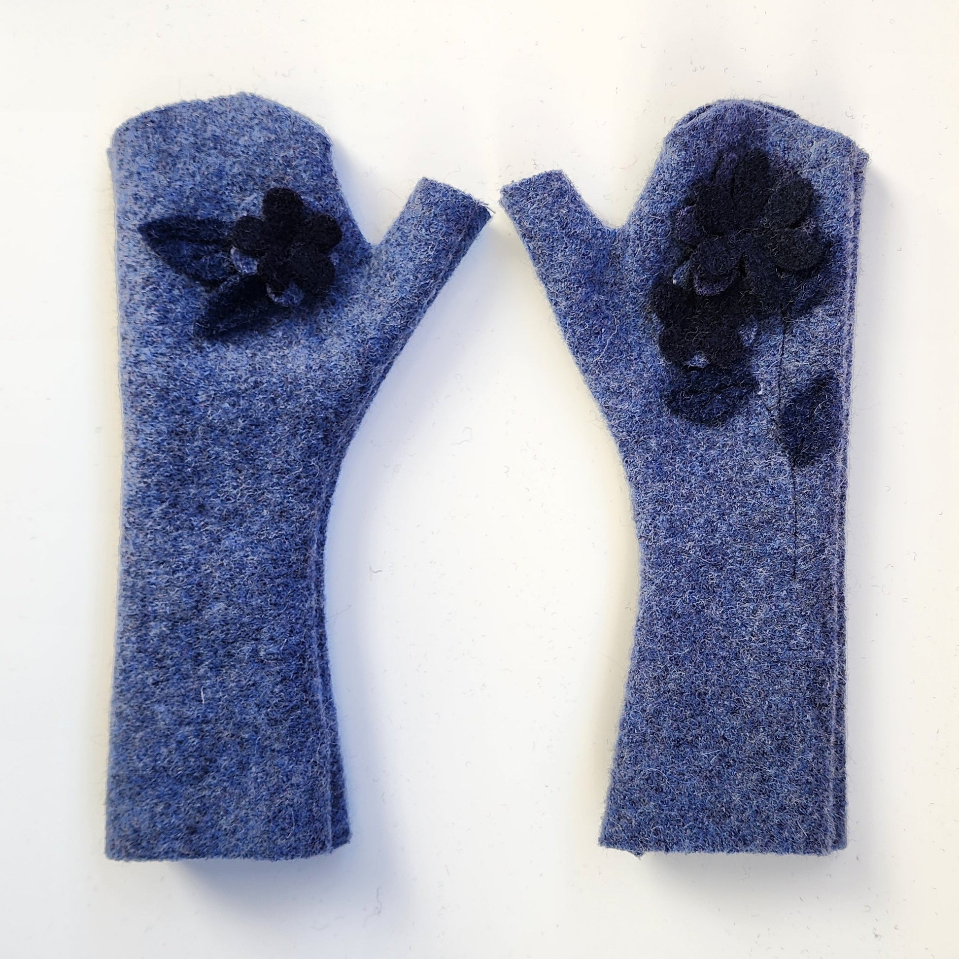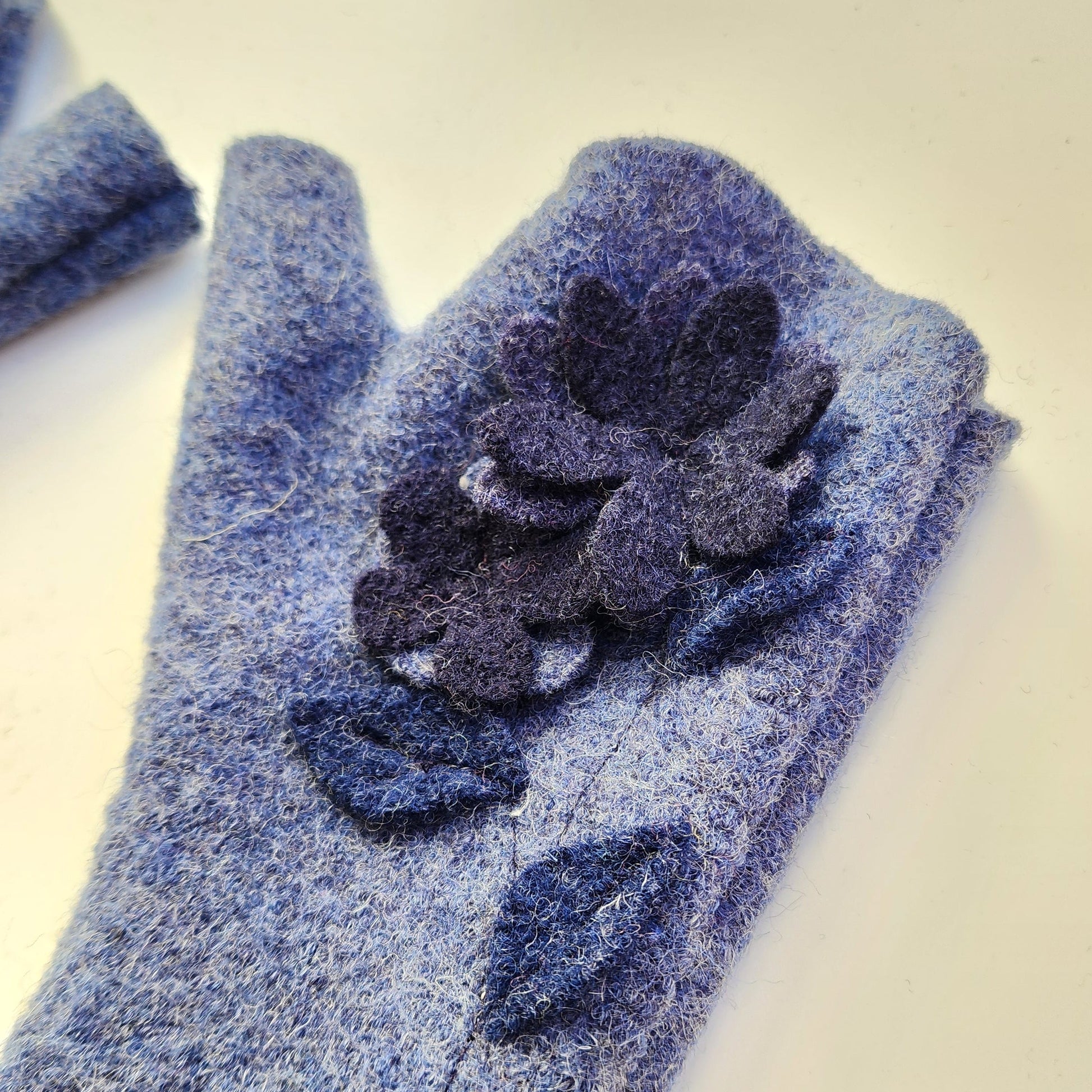 Diese blauen Handstulpen aus Schafswolle sind besonders durch die die Blumen ein absolutes Highlight. Edel und fast wie ein kleines Blumengesteck sind sie liebevoll an ihren Platz arrangiert worden.