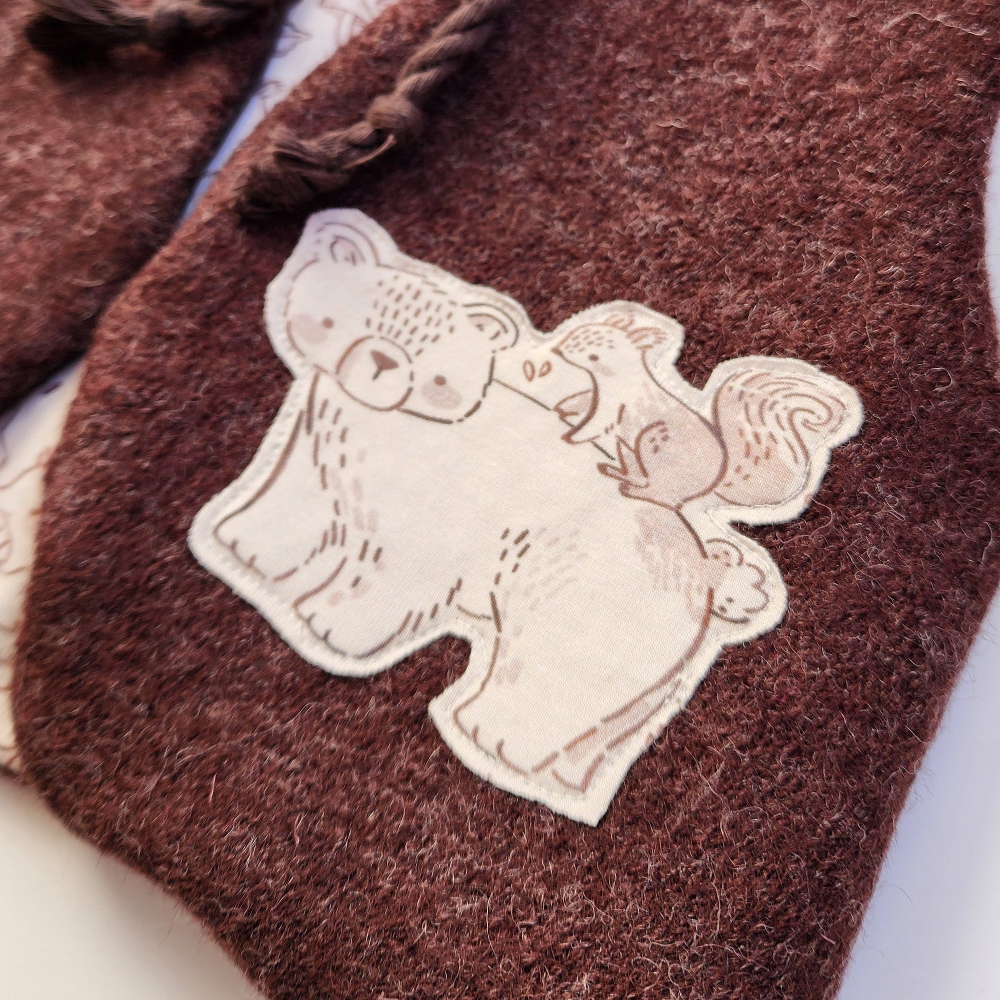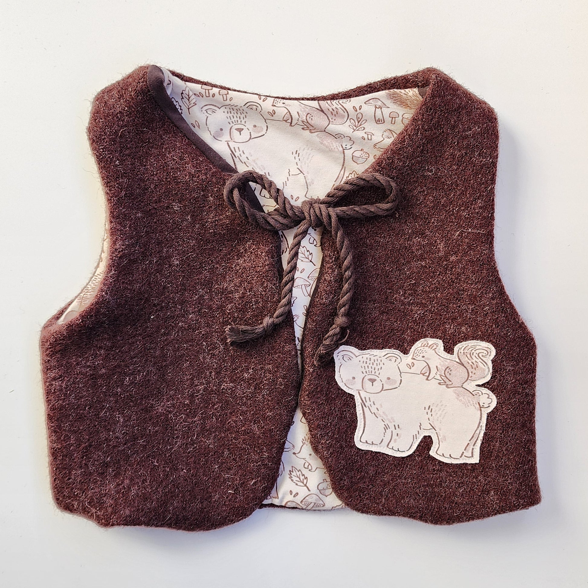 Diese dunkelbraune Walkweste ziert eine kleine Applikation von einem Bär und einem Eichhörnchen.