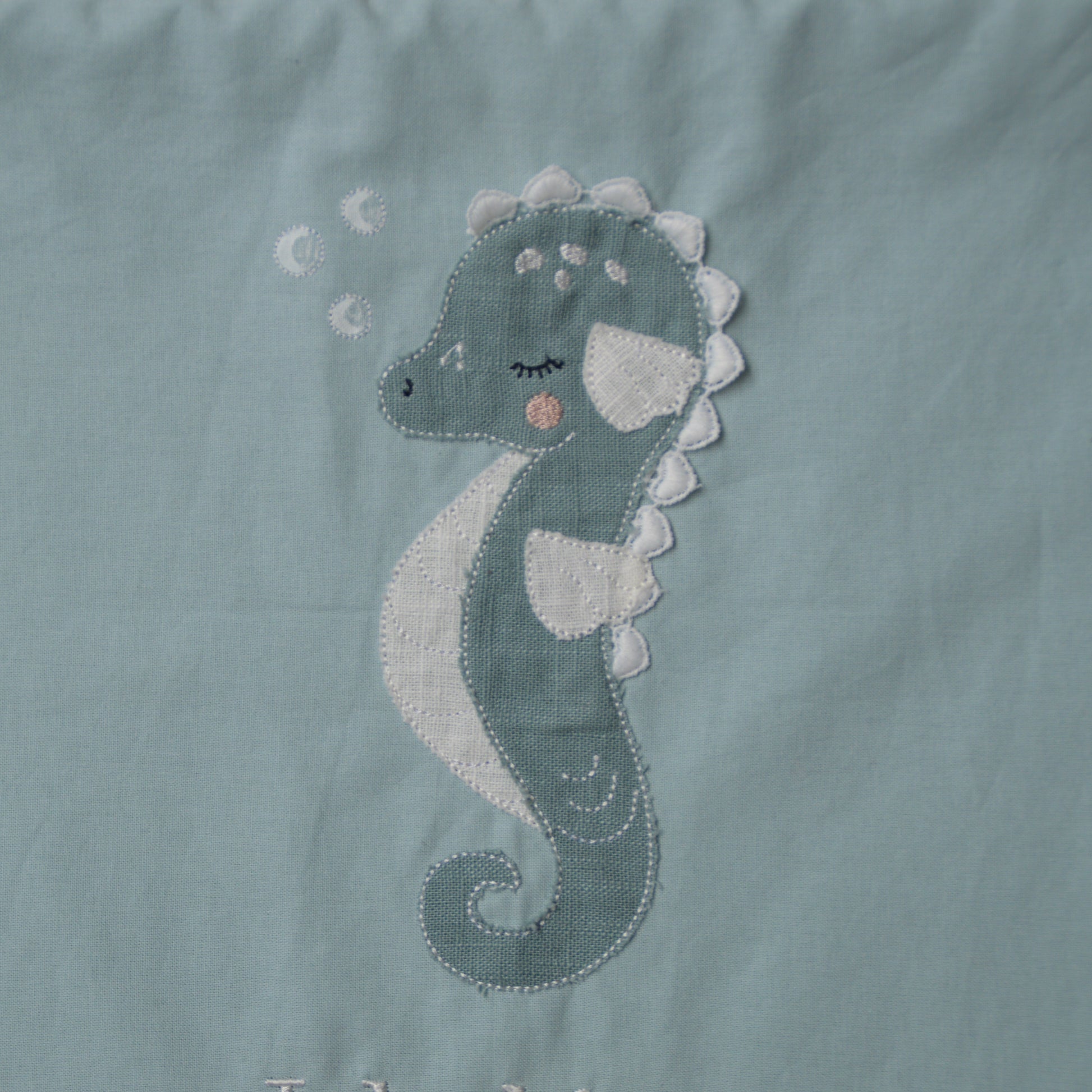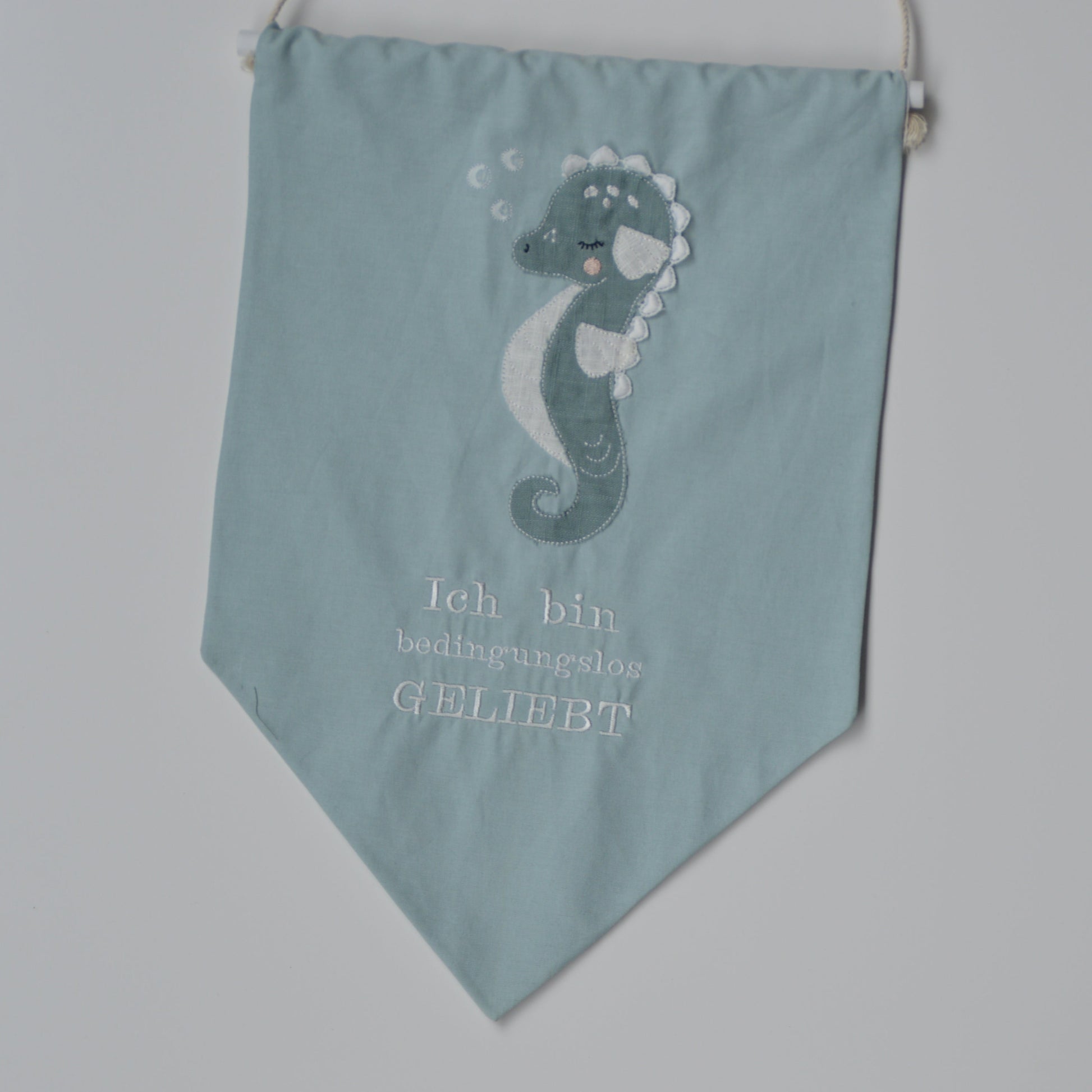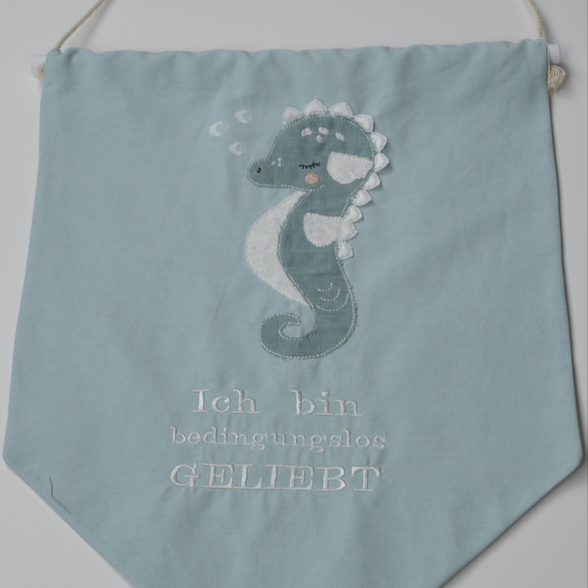 Dieses bezaubernde Wandbanner ist mit einem aufgestickten Seepferdchen und dem liebevollen Spruch "Ich bin bedingungslos geliebt" verziert. Es ist eine wunderschöne Dekoration für jedes Kinderzimmer, die mit ihrem sanften Design und der positiven Botschaft eine beruhigende und liebevolle Atmosphäre schafft.
